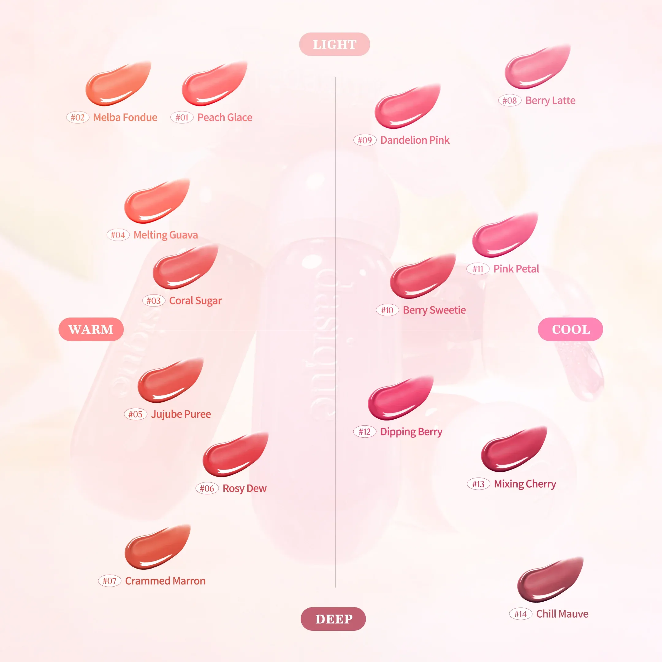 فرقی نمیکند پوست خنثی دارید یا گرم؛ پالت رنگی این مجموعه طوری طراحی شده که انواع تناژهای رنگی گرم و سرد را دربرمیگیرد. از هلویی خنثی گرفته تا آلو بنفش تیره، همه رنگها در این کلکسیون پیدا میشود.